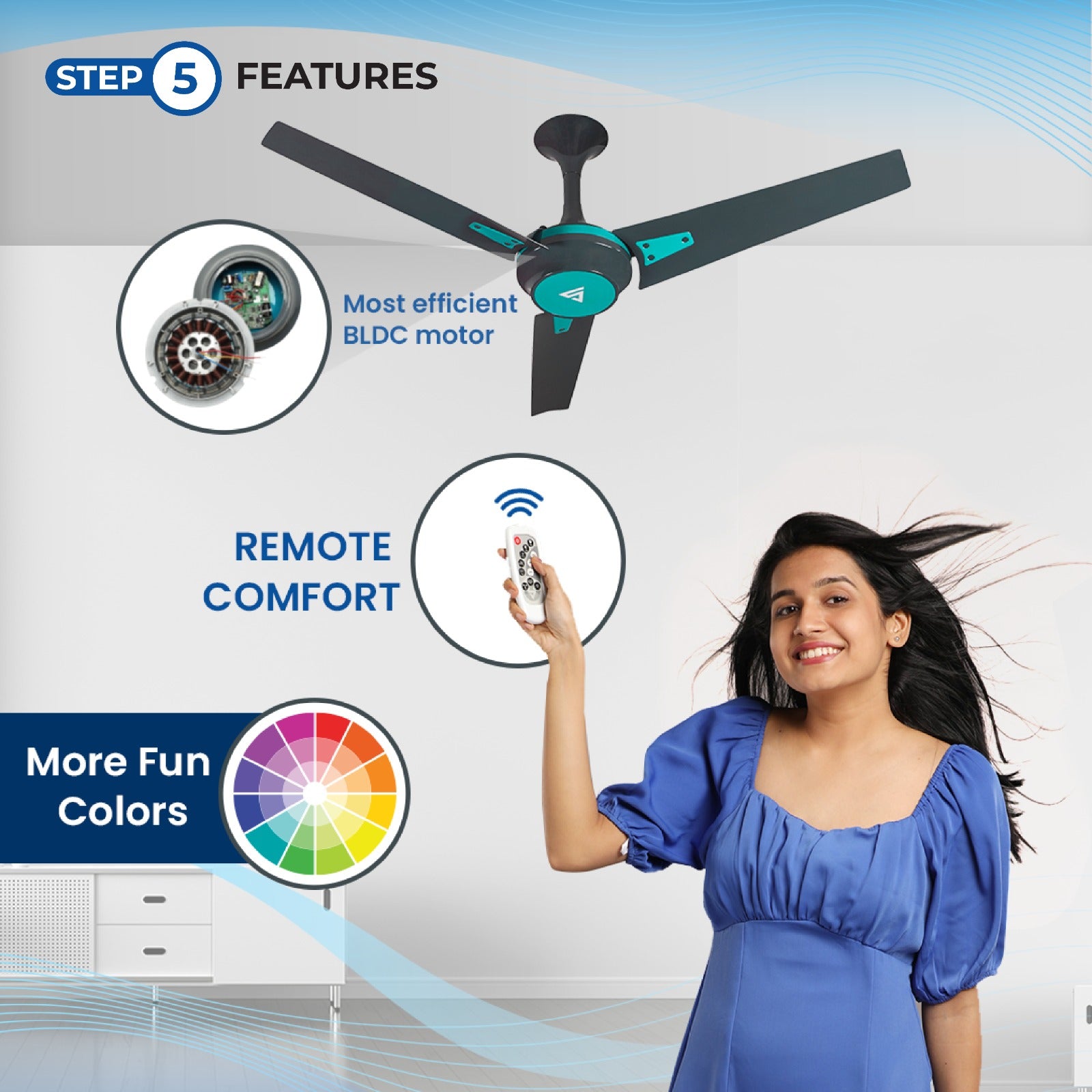 The final step involves choosing the right ceiling fan that complements your room's aesthetics and meets your functional needs. Consider colors, blade shapes, and control options like remote control, lighting features, and IoT capabilities.