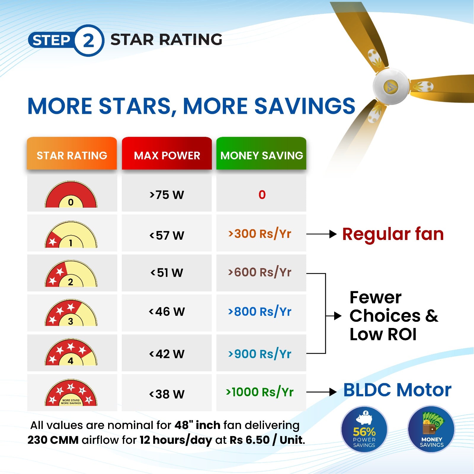 This rating is an indicator of the efficiency of the product, in fan, this efficiency is measured with a parameter called service value. Service value is the ratio of airflow to energy consumed at the highest speed setting. This service value is then used to categorize the BEE star rating, 1 star being the least efficient to 5 stars being the most efficient. The image below indicates prospective savings for fans with each star rating category for a 48-inch 230 CMM ceiling fan.