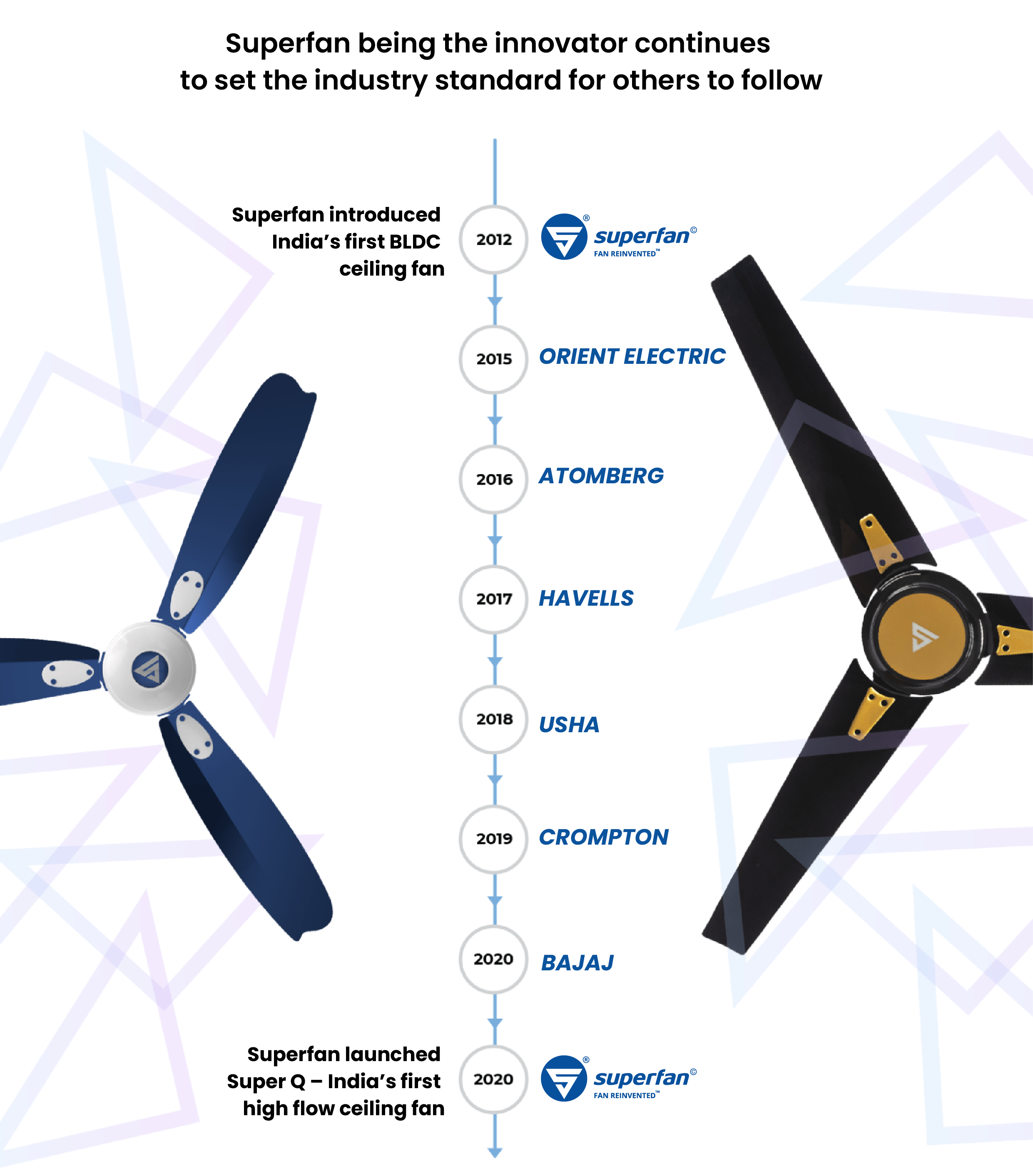 Superfan developed the world's most efficient BLDC motor in 2012, which reduced the power consumption of the ceiling fan by more than 50%. The other integral part of a fan is its blades. Superfan developed a cost-effective ceiling fan blade that increased the efficiency further by 30%. This first model that utilized this design became the most efficient ceiling fan in India in 2021.