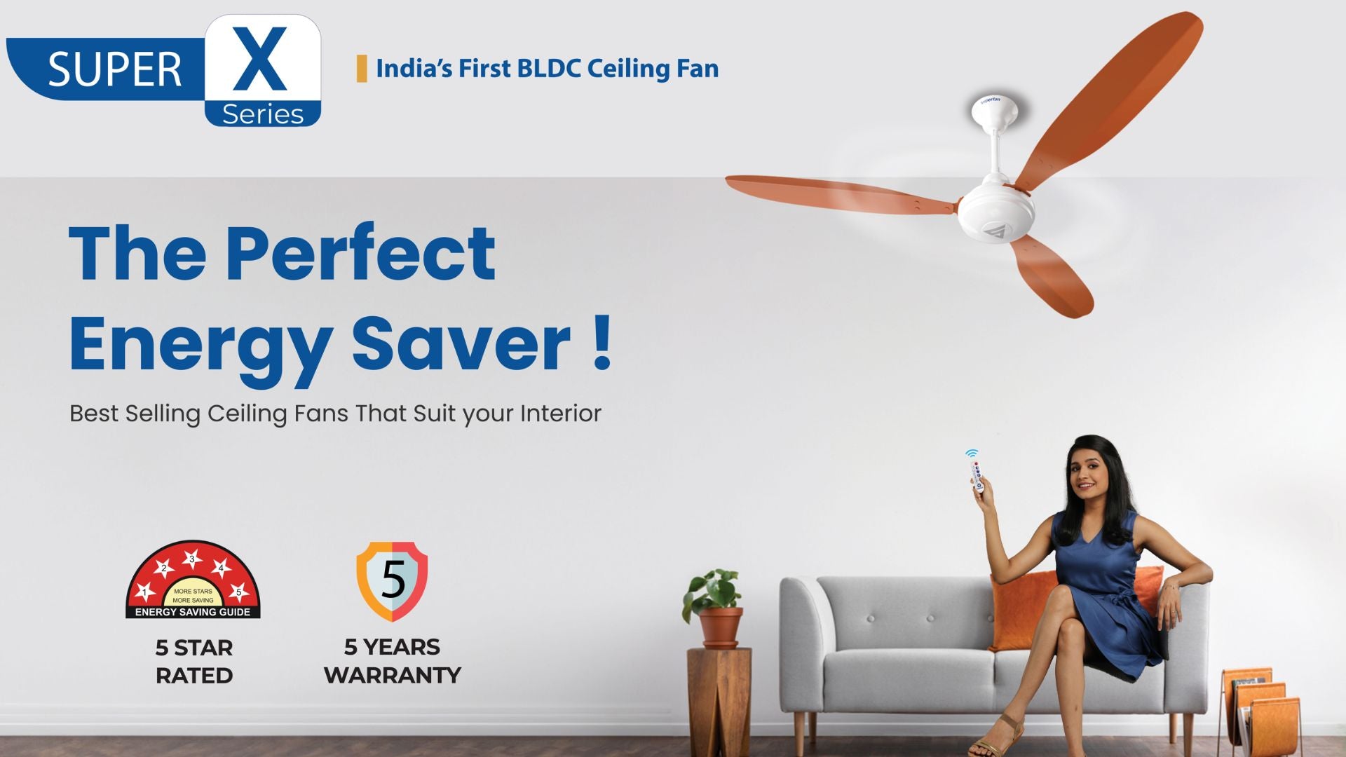 Super X1 is our award winning, high speed super energy efficient ceiling fan that is suitable for personal spaces at work and home. The power consumption of 35 W easily surpassed the 5-star rating by the Bureau of Energy Efficiency (BEE) while delivering better air delivery than regular fans that consume 75W.