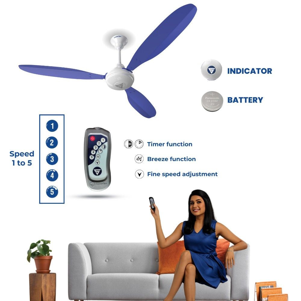 Drop-safe Remote:Specially designed to consume less energy and be argonomically handy. It has special features timer function, natural breeze mode and fine speed control.